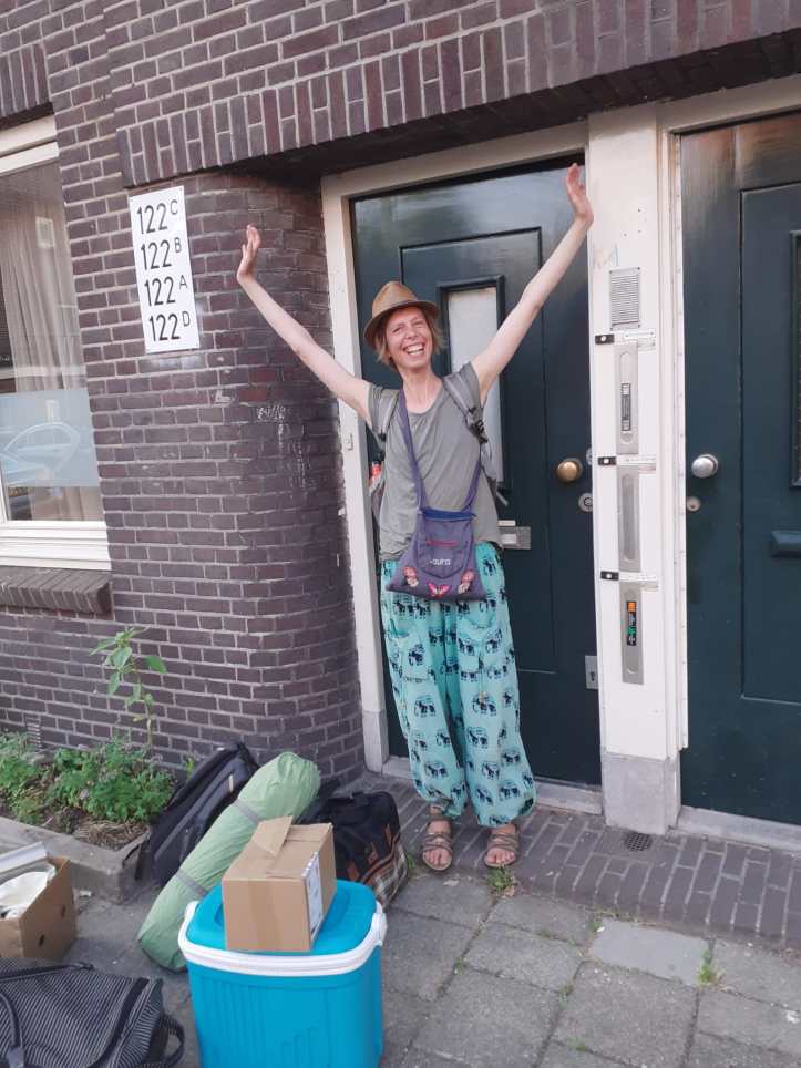 Ik bèn nu al die reizende schrijver. ‘I am traveling the road, sharing my medicine’, zoals mijn idool Fia zingt. Dit besef maakt mij zoveel levendiger, krachtiger, vuriger. Ik leg dit gevoel voor de zekerheid op beeld vast, tussen de kampeerspullen voor mijn Amsterdamse voordeur. Zodat ik weet als ik in een lamlendige groef beland: deze kracht is er ook!