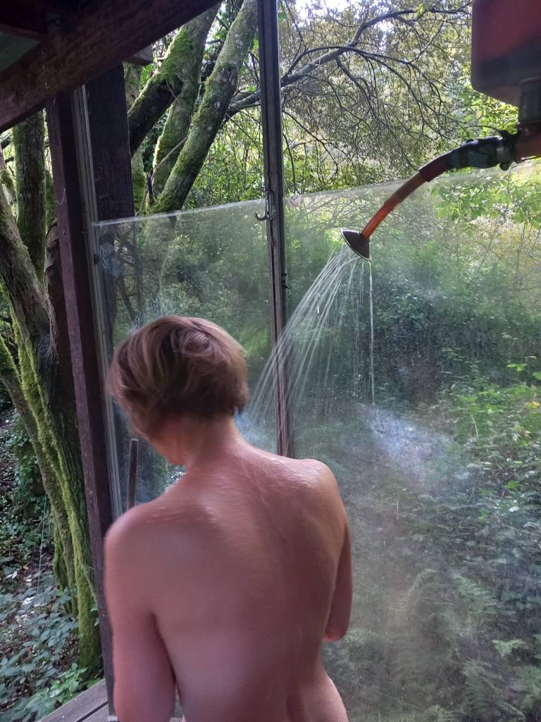 En dan het avontuur waar ik het meest naar uit kijk: de off-grid buitendouche! Gastheer en beeldend kunstenaar Wido heeft die zelf in elkaar geknutseld. Eerst haal je één tot vier emmers water bij de pomp. Deze giet je in een grote ijzeren pan op een gaspit (met gasfles) om het water te verwarmen. Vervolgens doe je het warme water weer in de emmer, klimt op een keukentrapje en giet het in een reservoir met een omgekeerde douchekop. Douchekop even omdraaien, et voilà – een douche met uitzicht op het bos.